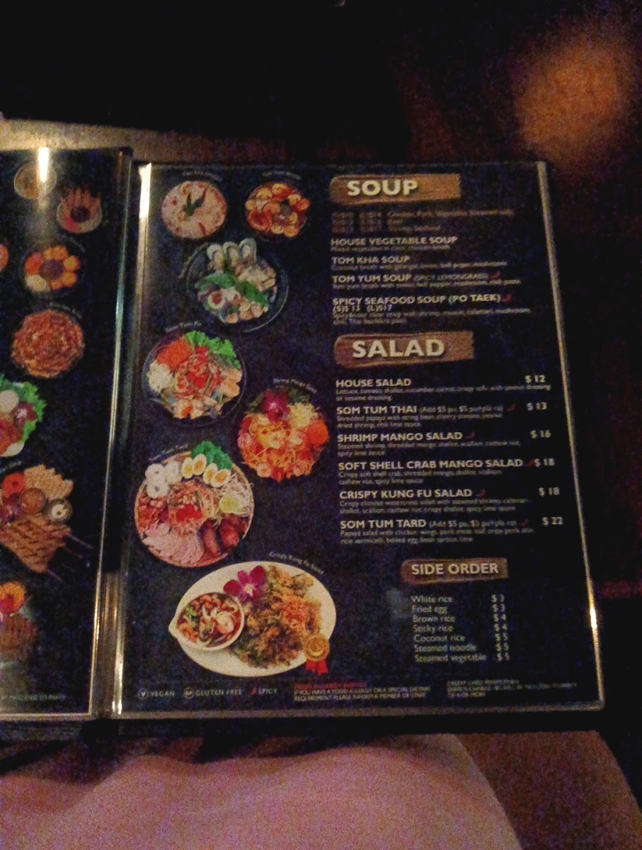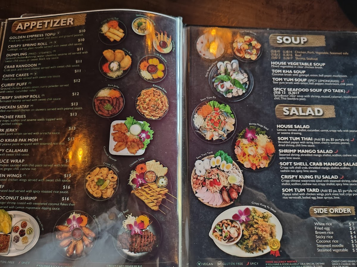 The menu showcases a delectable array of dishes that highlight the essence of Thai cooking. For those seeking refreshing beverages, don’t miss their Thai Iced Tea and the sweetly invigorating Lychee Thai Iced Tea, each priced at just $10.00. Pair these drinks with standout items like the Fire Water Spinach, where sautéed water spinach meets aromatic garlic and soy sauce for an unforgettable flavor explosion. Vegetarian options are plentiful, with dishes like the Spicy Basil Eggplant, brimming with succulent eggplant, spicy basil sauce, and fresh vegetables, all available for just $17.00.